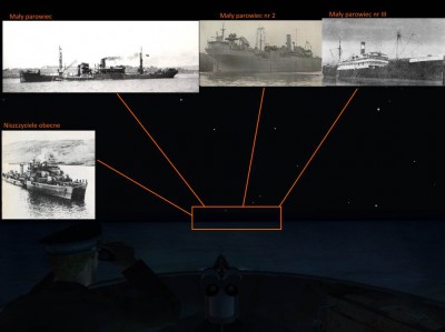 Atak z zanurzenia ze średniej odległości. Wyrzutnia 1,2 ,3,4 . 2 torpedy do pierwszego parowca, po jednej do dwóch kolejnych, po wystrzeleniu zachowujemy się cichutko, nic nie przeładowujemy.