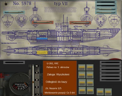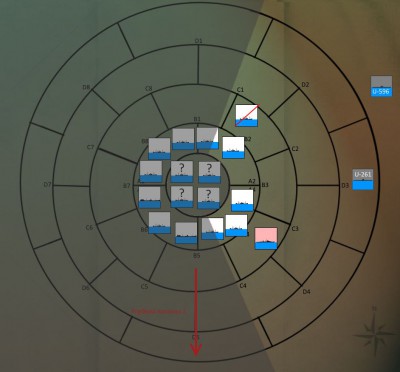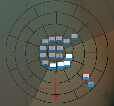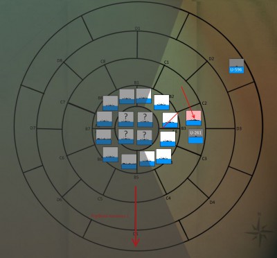 Kapitan zszedł do centrali po krótkiej obserwacji i wraz z nawigatorem spojrzeli na mapę. Wielkie koło oznaczało możliwą pozycję konwoju. Wschodnią część koła mogli śmiało wykreślić, chyba, że konwój zawrócił, ale raczej na to się nie zanosiło. Mogli tylko wytyczyć przybliżony kurs i iść śladem konwoju, licząc, że ktoś inny go śledzi i wkrótce nada komunikat. Dodatkowo Lew pewnie ocze3kiwał we Francji na raport z ataku.