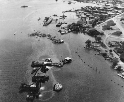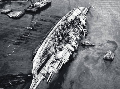 Okręt wszedł w kanał portowy i kierował się w stronę bazy okrętów podwodnych. Gdy wpływali do portu, uwagę wszystkich na pokładzie przyciągnął pochylony pod kątem 45 stopni ogromny kadłub, zaczepiony wieloma linami do nabrzeża. Brak masztów, jak i ślady działania wody na pokładzie, świadczyły, że okręt znajdował się niedawno na dnie. Nieznacznie dalej na wodzie znajdowała się dziwna, wystająca spod wody konstrukcja, za którą, niczym tło, stały dwa lotniskowce.