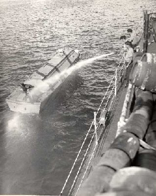 Drone Boat.jpg Za?oga USS Begor obmywa ??d?,kt?ra wyposarzona w sprz?t pomiarowy rejestrowa?a dane z wybuchu. 8 takich ?odzi u?yto w pr?bie"Able" i 6 w pr?bie"Baker"