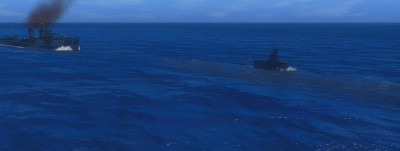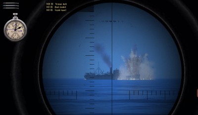 Cel wyraźnie zwolnił, ale jedna torpeda kontaktowa w burtę to niezbyt dużo. Ponieważ ciągle zbliżaliśmy się i odległość do celu spadła do pół mili, poleciłem wystrzelić dwie kolejne torpedy. Jedna z nich trafiła w rufę celu, a kolejna w śródokręcie.