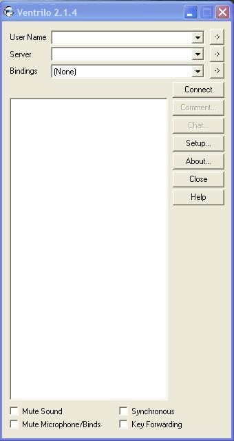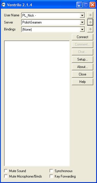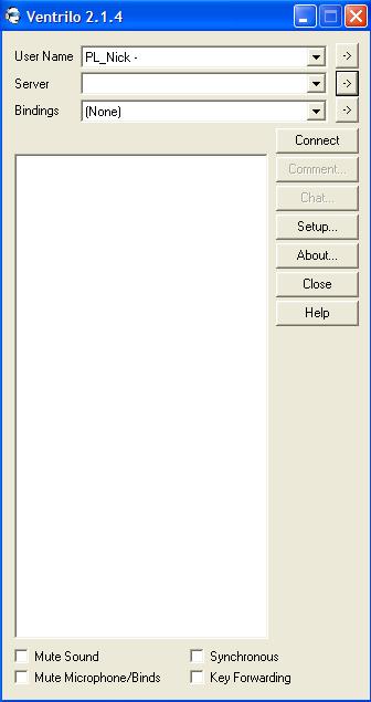 zatwierdzamy nasze wpisy OK na Setup new user i jeszcze raz OK na Setup User i powracamy do pierwotnego wygladu Ventirlo. Konfiguracje naszego NICKA mamy juz za soba. Teraz kolej na ustawienie serwera z którym nasz program Ventirlo musi sie połaczyc: