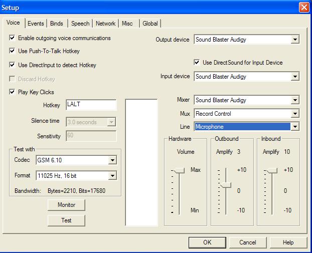 W zakładce Voice po lewej stronie zaznaczamy "ptaszki" tak jak na rysunku, w polu Hotkey ustawiamy kursor i przyciskamy klawisz z klawiatury który bedzie uaktywniał nam mikrofon jak bedziemy chcieli cos powiedziec w tym wypadku jet to prawy Ctrl.