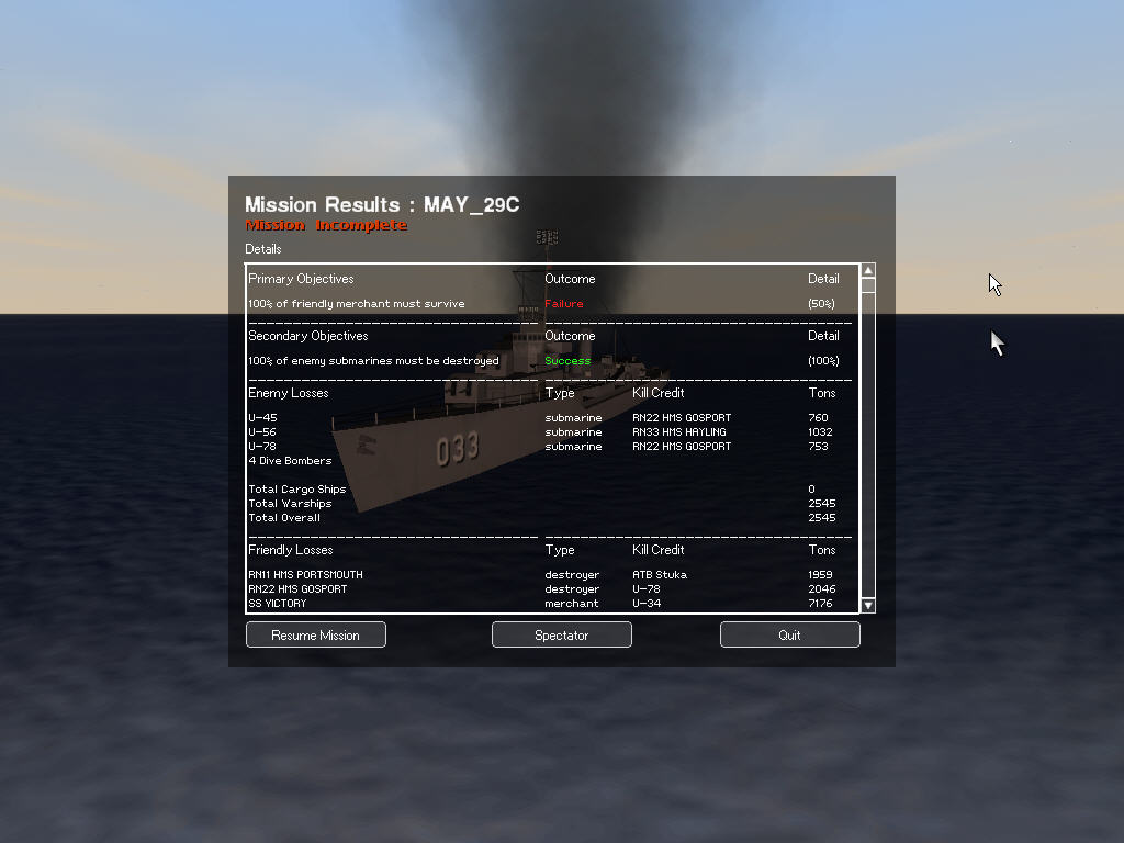 Niestety po blisko trzydziestominutowej walce okrety zwyciezyly zatapiajac oba niszczyciele same tracac tylko dwa z trzech wykrytych... No to zostalem sam.