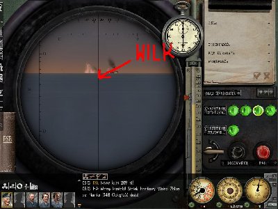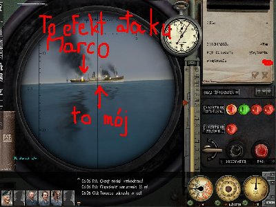 C3 zaatakowałem z daleka. Na przybrzeżnego wpadłem, gdy wychodziłem na peryskopową... Fregata, która zatopiła wilka stała dokładnie między mną, a konwojem, uniemożliwiając mi dobre wejście. Jeszcze po zatopieniu z daleka C3 okazało się, że konwój się rozproszył. Z mojego punktu widzenia wyglądało to, że konwój skręcił i za chwilę będę na flance. Musiałem zaryzykować. Prawie mi się udało. Udało mi się uniknąć fregaty, ale nie tego niszczyciela, co szedł jej na pomoc. Zagoniony na 180 metrów przeładowałem 2 torpedy i wyszedłem... wprost na płonącego mercha. Prawie bez liczenia go storpedowałem. W sumie chyba nawet był błąd pomiaru.. Ale trafiłem. Potem razem z Marco próbowaliśmy jeszcze zatopić małego tankowca, ale uciekł nam obu...