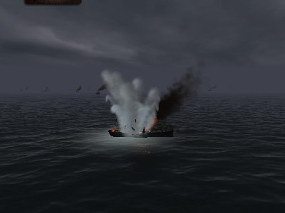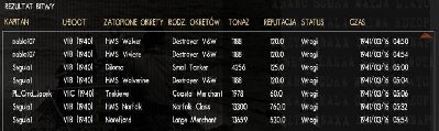 Zacząłem celować w tankowca - pudło, kolejne torpedy pudło - nic dzisiaj nie chciało wychodzić. W końcu odpaliłem torpedę w mały frachtowiec - eksplozja i konto już nie jest puste. Dalej uszkodziłem parowiec - niestety odpłynął dalej przechylony na prawą burtę. Gdy celowałem w tankowiec, zastałem wykryty i wpędzony pod wodę. Udało mi się wyrwać z okrążenia i wyjść na peryskopowa - lecz po co, jak kolejne 3 torpedy minęły swoje cele . Tymczasem Syguła szalał, kolejne statki szły na dół, choć nie wszystkie BdU uznało (w raporcie napisał, że dodatkowo zatopił DD, tankowca i C2 - ale jak każdy dowódca uboota pewnie przesadzał