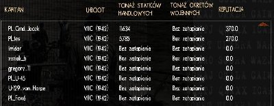 Los rzucił nas w dogodnej pozycji na kursie kolizyjnym z konwojem. Część z nas wynurzyła się i ławą ruszyliśmy w kierunku nadpływających statków. Po drodze minęliśmy dwa neutralne statki (szwedzka flaga). Alarm bojowy i zanurzenie, gdy zauważono od dziobu okręt wojenny. Powoli zbliżamy się, widać nadpływające statki handlowe. Lecz DD-ki wykryły Imidara i rozpoczęły polowanie na niego tarasując nam dojście do zdobyczy. Imidar poległ. Zaraz potem polski niszczyciel topi Foxa. Strzelam torpedę w Medium Cargo - w celu. Zaraz potem ten sam statek trafia torpeda Tesa - która okazuje się skuteczniejsza, bo statek tonie. Cel w Granville - w celu - statek zatrzymuje się.