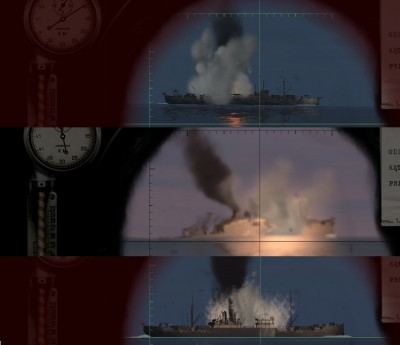 Musze pochwalic ta misje, dawala szanse ucieczki i drugiego podejscia. W pierwszym podejsciu wystrzelilem dwie torpedy do tankowca i dwie do duzego mercha i zaraz musialem uciekac. Na szczescie ponizej 100m pingi eskorty byly bardzo sporadyczne albo zadne i mnie nie znalezli (dobry rok dla nas). Trafilem tankowca co sie okazal wcale nie byc tankowcem. Strzaly do mercha byly pudlami, bo on byl dalej i inny kat a walilem na tych samych ustawieniach co ten pierwszy cel. Po odejsciu eskorty mialem czas aby sie wynurzyc i wypalic dwie torpedy do nastepnego tankowca co nie byl wcale tankowcem. Ten wybuchl po pierwszej a ja znowu wialem glebiej bo wrocil do mnie jeden niszczyciel.