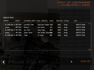 Na początku gry łapię kontakt... Odnajduję konwój i atakuję z flanki. 1 przedwczesna, 1 pudło i 2 trafienia w 1 z dwóch celów. Zatrzymał się... To dobitka... Tonie. HUNT się kręci w pobliżu... Wykrył mnie, gdy torpedowałem drugi cel, który zatonął potem na równej stępce, jakby ktoś go pociągnął. Ale musiałem wiać na głębinę (100m). Pawliczek traci połączenie z netem i wylatuje