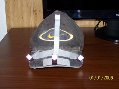 Czapeczka ma chyba z 10 lat ,ale za to firmowa Odblaski ( taśma odblaskowa zakupiona w pasmaterii - taki sklep z kolorowymi tasiemkami ,nićmi ,igłami ,guzikami itp. 1,50 za metr . potrzebujemy dosłownie 4cm bieżące . Przylepiłem to do metalowych kawałów blachy powlekanej z parapetu ,akurat miałem pod ręką ( to jest wersja hardkor . Ale zamiast tego można użyć puszki z pepsi , piwa , coli itp .Blaszki można wyciąć zwykłymi nożyczkami do papieru . Wszystko jak widać przylepiłem najzwyklejszym plastrem . , a odblaski za pomocą taśmy obustronnie klejącej .( kleje szybkoschnące nie dały rady w połączeniu z metalem ). Co jeszcze ? Hmm kamerka z wbudowanymi diodami IR (tylko jeden model sie do tego nadaje ) i nie wymaga ,żadnych trudnych modyfikacji . Wystarczy tylko zakleić czujnik natężenia oświetlenia ,a na obiektyw przykleić kawałek kliszy fotograficznej ,lub dyskietki ,albo szkiełka z okularów przeciwsłonecznych .