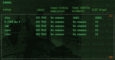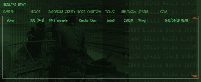 Ja źle wyszedłem... Wystrzeliłem 6 torped osiągając 2 niewypały i 1 trafienie okrętu klasy Repulse, ale wypingali mnie i musiałem wiać na głębinę... Ścigany zostałem na niej do czasu, aż wysłuchałęm, że jestem za konwojem. Bez szans na atak zostałem w głębinie.
