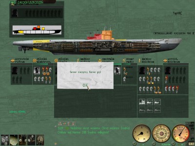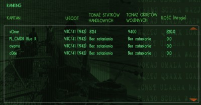 Długo grzałem do konwoju na peryskopowej. c0de lazł sobie na powierzchni, aż nagle go wywaliło. Jego truchło przyleciało obrzucić pięć 'suszarek'. Strzeliłem do Nelsona. Nie wiem czy spudłowałem, czy przeszła pod nim. Był wykalkulowany podwójnie dla pewniaka. 7,5W. Potem zrobiło się gorąco. Clemson męczył mnie strasznie. Wiejąc odpaliłem ryby. Trafiły w cel, aż Finek zagwizdał . Zwiałem na 150m. Po drodze w dół trochę mnie podrapali ale hull się utrzymał. Tam zostałem cicho zygzakując. Suszarki odpłynęły. Finek ogłosił koniec i zamknął serwer.