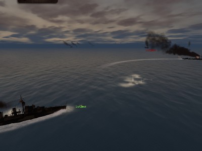 Potem oglądałem śmierć Oyamy (zakończenie jego najlepszej, 3-patrolowej kariery, w której zatopił prawie 12 000 BRT) [3.jpg] i sOnara oraz walkę c0dem, który był "za konwojem" wśród kilku zapętlonych frachtowców i lotniskowca. Eskorta była już za nim, ścigając resztę. c0de mógł zatopić kolejny statek, ale zamiast dobić uciekający, wolał dobić drugi... I ten drugi też nie zatonął. A DD do końca patrolu krążyły wokoło ścigając (martwych) pozostałych. Jeszcze dopłynął FIJI, więc wyjście na powierzchnię byłoby samobójstwem.