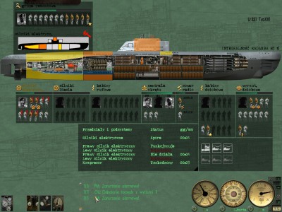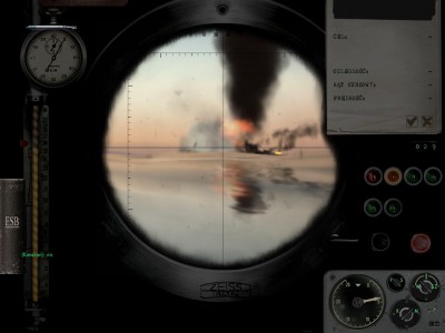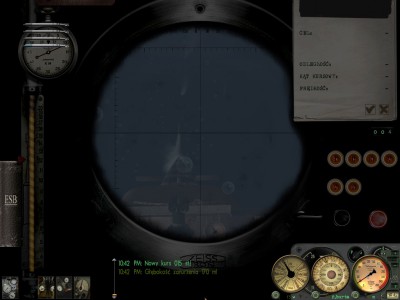 Już teraz za bardzo nie pamiętam jak to było, ale z około 2 km. zaczął prosto na mnie iść DD-ek, jeden akustyk poszedł bez zbędnego namierzania (i tak płynęliśmy wprost na siebie) i poszedł na dno, potem próba zniszczenia kolejnego nie powiodła się bo się zatrzymał i akustyk poszedł przed siebie ;) Tym pudłem się zdradziłem (i jak się okazało innych też) więc poszedłem na 300 m. Przy 285 m. żarówki poszły ;) Po dłuższym czasie postanawiam pójść na 50 m. i za pomocą namiaru z hydro puścić gdzieś akustyki, jeden trafił w handlowca, a drugi w fregatę zatapiając ją. Z powrotem na 250 m. i po przeładowaniu powtórzyłem manewr. Niestety zostałem wykryty i bomba wybuchła niedaleko (szczegóły na fotkach). Patrol był dobry, ale strzelanie na zasadzie "tam coś słyszę to akustyka, mniej więcej, tam puszczę" mnie, że tak powiem nie satysfakcjonuje, jednak innej możliwości nie miałem, więc...