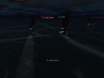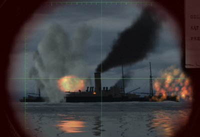 No a teraz o mnie: początek misji i pierwsza myśl: czy ja taką pogodę dałem?? Ehh widać się pomyliłem, założenie było takie aby powystrzelać kutry z działa. No ale płynę dalej. Na horyzoncie widzę grupę uderzeniową. Chciałem zatopić pancernik, ale stwierdziłem, że lepiej nie ujawniać się przedwcześnie i mu odpuściłem, po kilku minutach wyleciał w powietrze.