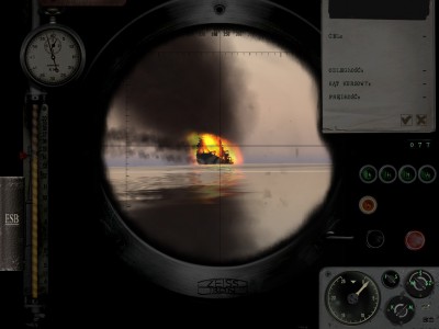Z początku płynę ostrożnie, bo już po wyjściu na peryskopową widziałem dymy. W 5 minucie gry bardzo się zdziwiłem, bo zorientowałem się, że niszczyciel płynie prosto na mnie, jak mnie wykrył? Nie wiem, ale zalałem dziobową torpedę i czekam aż podpłynie, niestety zaczął zygzakować. Musiałem obrócić się, miałem go na namiarze 60 i posłałem akustyka, niestety był już tak blisko, że musiałem uciekać w głębię, czyli... na 50 metrów... Oberwałem jeżami, ale żyłem, zdążył tylko kilka bomb zrzucić, na szczęście niecelnych i dostał akustykiem. Wychodzę na peryskopową, żeby zdjęcia zrobić jak tonie i ku mojemu zdziwieniu zobaczyłem tylko jak płynie sobie dalej, nie ma najmniejszego przechyłu, lekko płonie, potem widziałem, że mu tylko jedna śruba odpadła... (3 patrol w ostatnim czasie gdy mój akustyk nic nie robi...). Taki płynący niszczyciel, pomimo że nie zaatakuje to jednak niestety może pingować i miałem na głowie kolejnego, a akustyka brak. Posłałem w nadziei salwę, ale nie trafiły. Jeże mnie poważnie uszkodziły, a bomby dobiły.