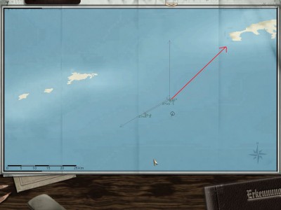 W końcu się zapytałem czy ktoś jest na powierzchni i czy zna kurs konwoju. Długo była cisza, ale w końcu Jacek melduje o konwoju i podaje kurs 240, trochę mnie zaskoczyło, że z taką dokładnością zna kurs konwoju, spodziewałem się informacji północ, południe, wschód, zachód. No ale nie ważne, istotne że znałem kurs konwoju. Zanurzyłem się, oszacowałem pozycję konwoju (znacznik 1 na mapie, oszacowałem kurs [strzałka na południowy zachód to kurs 240] i mniej więcej oszacowałem punkt kontaktu). Pod koniec patrolu zrobiłem zdjęcie mapie i moim przewidywaniom, a czerwona strzałka oznacza szacunkowy kurs rzeczywisty +-20*. Potem się zorientowałem, że Jacek musiał podać mi namiar względem jego U-Boota, a nie kurs konwoju.