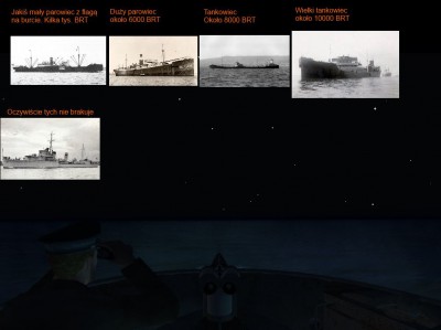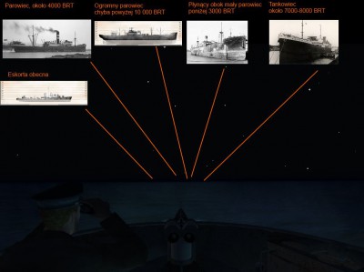 W oddali widać sylwetki, prawdopodobnie frachtowców. Idziemy na powierzchni szukając najlepszej drogi na pozycję torpedową. Wyprzedzimy lekko konwój. Uważajmy tylko, aby nie staranować innego wilka.