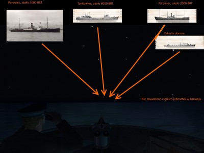 Eskorta składała się z kilku niszczycieli. Przynajmniej z trójki. Konwój szedł kursem 270 ze średnią prędkością 6-7 węzłów. hałas w eterze pojawiał się tylko przy zwrotach konwoju, świadcząc, że kapitanowie niezbyt chyba sobie radzą z pływaniem synchronicznym, choć był to "najlepiej trzymający się kupy konwój, jaki Andreas widział w swoim życiu".
