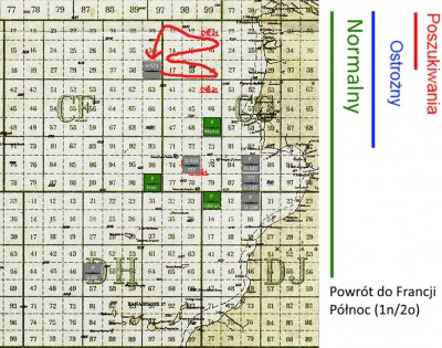 -Witaj. Jurgen Wolf, tak? Dobrze Jurgen, przedstawie Ci swój pomysł na dotarcie do wyznaczonego kwadratu, a Ty jako specjalista dopracujesz szczegółowo tę trasę. Słuchaj więc, a najlepiej sobie gdzieś zapisz. Po wyjściu z Kilonii, pełną prędkością przepływamy przez kanał, potem pełna prędkość aż do AN65. Ostrożną prędkością kierujemy się na płn-zachód do kwadratu AN27. Nadal będąc ostrożnymi do AF78, potem AM32, AM25, AM41iii na połdunie aż do CF33. Od BE6 wracamy do pełnej prędkości. Zrozumiano?