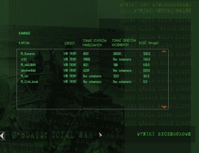 Mnie niestety zabrakło szczęścia w tym patrolu. Konwój był idealny, by spokojnie zatapiać. Pozycje miałem prawie idealną. Pierwszym celem był bodajże Fast Freighter (ok. 12000BRT). Zbieram spokojnie dane, następnie odpalam salwę dwóch torped. Trafiły idealnie w rufę i dziób pod kilem. No ale on płynie dalej. Szybko by mi nie uciekł posłałem jeszcze jedną rybkę która wybuchła w okolicach dzioba pod kilem. Chyba nawet tego nie zauważył bo płynął dalej szczęśliwy, w dodatku przyspieszając a ja zmarnowałem trzy torpedy, szkoda mi było czwartej. No trudno. Następnie płynął przede mną jakiś frachtowiec (6000BRT). Posłałem rybkę, wybuchła idealnie pod kominem. Zatrzymał się, więc z rufowej posłałem kontaktówkę w dziób. Nie chce tonąć. Czekam na torpedy do przeładowania, po czym ślę magnetyczną pod kil. Nie wziąłem jednak pod uwage, że nabrał już wody i jest nieco niżej. Torpeda zmarnowana. No trudno, muszę czekać 10 min by go dobić. Ostatnia kontaktówka na szczęście dokończyła dzieło. Tymczasem wszystkie fajne cele mi uciekły. Ustawiałem się na pozycje, by rufową strzelić w jakiś mały statek (chyba 4000BRT), tymczasem słyszę już pingi. Ale chciałem przynajmniej wystrzelić tą jedną przed zanurzeniem. Strzeliłem (chyba nawet nie trafiając) po czym zanurzenie na 140m. Po 5 minutach chciałem sprawdzić na peryskopowej czy sytuacja się uspokoiła. No ale, że znowu pingujo, to znów zanurzenie 150m. Płynę tak 10 minut, po czym znów się wynurzam tym razem powoli. Jestem już tak na 80 metrach, po czym słyszę bombki w okół mnie. Cały okręt czerwony, wszyscy zginęli no i KIA. Bez pingowania, prawdopodobnie Ddek zrzucał bomby na ślepo, bo nie mógł mnie usłyszeć.