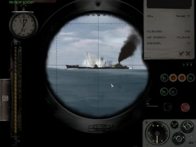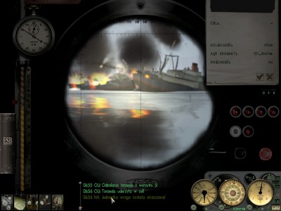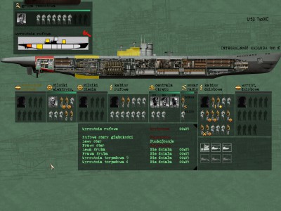 Nagle znikąd pojawia się kolejny, który płynie prosto na mnie... Nie było mowy o unikach na peryskopowej... Zanurzenie. Na 25 metrach pluski, na 30 mną wstrząsnęło. I to tak konkretnie. Uszkodzone działko przeciwlotnicze. Integralność 100%. Uszkodzone silniki elektryczne. Zniszczone wyrzutnie rufowe, zniszczony prawy ster, prawa śruba nie działa, lewa śruba nie działa, obie wyrzutnie nie działają. Spory przeciek. Nie zdążą zatamować zanim go nie zniszczy. Chief do przedziału, marynarze do przedziału, mechanik z grupą remontową do przedziału... Jak oni się tam pomieścili to ja nie wiem... :8) Ale zdążyli w ostatnim momencie powstrzymać przeciek.