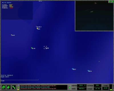 Po rozejściu i wypuszeczeniu anten sonarów uzyskaliśmy dość wczesne wykrycie okrętów podwodnych przeciwnika, łapiąc kontakt z SSN Amethyste działającym po środku rejonu (okręt był trudny do śledzenia) oraz SSN Los Angeles przechodzącym przez cieśninę pomiędzy dwoma wyspami na zachodzie.