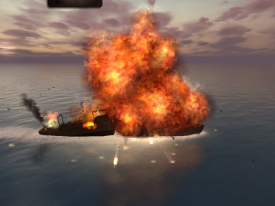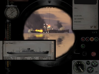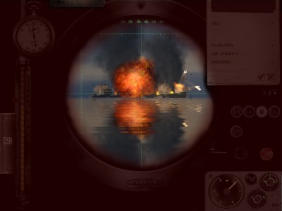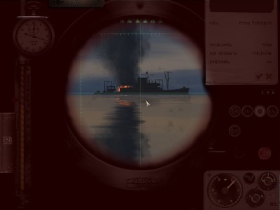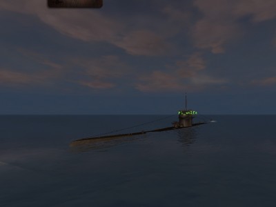 Sonar łoił ostro do troop'a a ten do mnie. Poszedłem na peryskopową (bo tylko na taką umiałem) z małym przeciekiem i poważnymi uszkodzeniami jednego przedziału. Kiedy ogarnąłem już co trzeba zrobić ponownie wynurzyłem okręt i udało mi się obsadzić w końcu załogę przy armacie. W tym momencie Sonar rozpirzył w drzazgi ścigany statek.