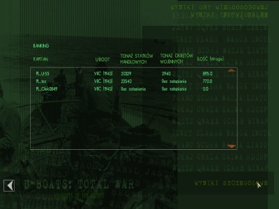 Dosc przyjemny patrol. Slyszac konwoj dosc daleko, postanawiamy sie wynurzyc. Niestety autor misji stwierdzil, ze wynurzyc sie nie warto i postraszyl nas samolotami. Na szczescie nieskutecznie. Podczas podejscia koledzy (..ga? ) dosc mocno halasowali odciagajac eskorte z mojej strony i pozwalajac na spokojna egzekucje lewej flanki konwoju. Tonaz bylby sporo wiekszy, ale uszkodzoniego linera i C3 nie pozwolila nam dobic eskorta. Uszkodzenia podczas pierwszej fazy ataku niszczyciela okazaly sie na tyle powazne, ze wynurzenie bylo mozliwe dopiero w ostatniej minucie patrolu.