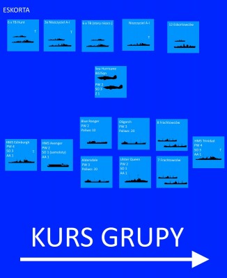 18 statków handlowych (w tym 3 zbiornikowce floty) obecnie było eskortowanych przez 16 niszczycieli, 12 korwet, 2 krążowniki oraz jeden okręt przeciwlotniczy i 1 lotniskowiec eskorty (ps. mam pomysł na misję SH3). Była to niezwykle silna eskorta, jak na taki mały konwój, ale i zagrożenie przeciwko któremu się kierowali było ogromne. Ich sukces zależał teraz od tego, kiedy wróg dowie się o ich obecności...