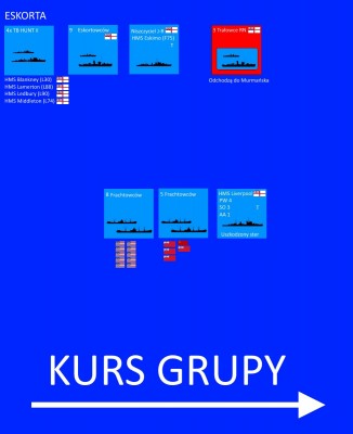 A co do rozkazów, to ja rozumiem ich sens, ale zgodzę się, że nie w obecnej sytuacji, gdy konwój jest osłabiony. To już lepiej byłoby oddelegować jeden-dwa niszczyciele do eskorty krążownika, który osobno, na pełnej szybkości, by wracał do Scapa Flow, wykorzystując prędkość do obrony. Bo tak to rzeczywiście niepotrzebnie to dzieli.