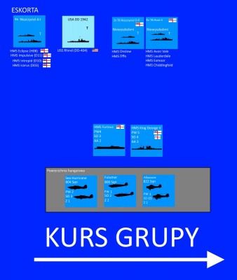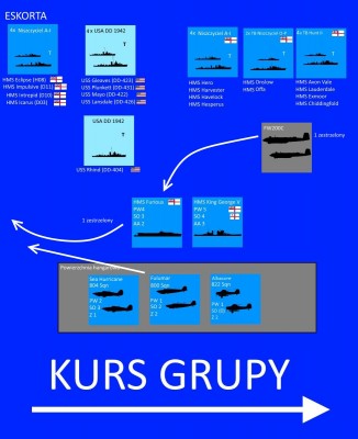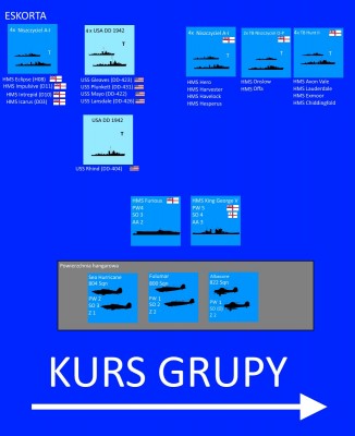 W kopercie były dwie wiadomości. Jedna z rozkazami, druga z dostępnymi siłami. Jack zaczął od tej drugiej i zaskoczony zaczął liczyć jednostki. 13 niszczycieli, 4 Hunty i 2 lekkie niszczyciele z wzmocnioną bronią p-lot (AA1). A całość do eskorty HMS King George V oraz Furiousa, którego ciągle wyposażano głównie w myśliwce. Ogromne siły. Jack spojrzał na drugą kartkę, aby poznać swoje zadnie.