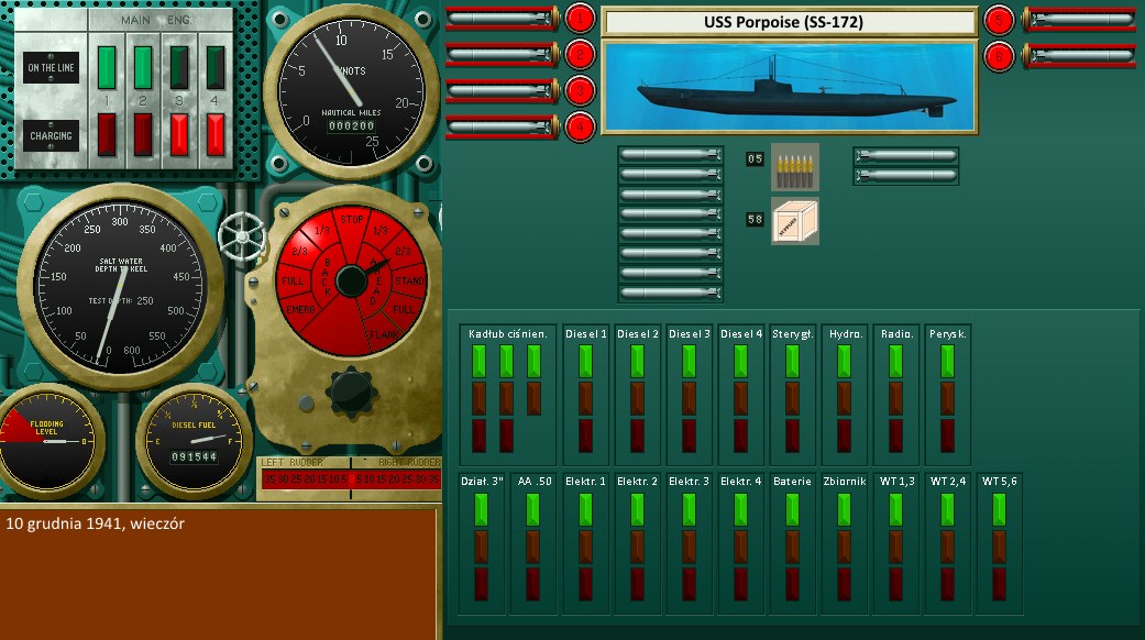 "Zarty sie skonczyly" warknal kapitan. "Chief, stan akumulatorow? Wystarczy na kolejny atak lub sledzenie celu do wieczora? Lee (Gardner - OU) zasuwaj sprawdzic torpedy. Chce miec pelny raport dlaczego zyroskopy toprped nie dzialaja prawidlowo. Masz 10 minut. Scott co ty na to, aby wyprobowac nasze dzialo w akcji? Mozemy sledzic cel do wieczora i potem wyjsc na pozycje do zaskujacego ataku na powierzchni. To jest niewielka krypa, a my mamy problemy z torpedami."
