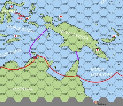 -Komandorze podporuczniku Karpinsky, nie mam dobrych wiadomości - zaczął dowódca 62DOP - Jak wam już zapewne wiadomo przed kilkoma dniami flota Australijska oraz nasze okręty osłaniające USS Yorktown zostały zdziesiątkowane pod Guadalcanal i sądzę, że spodziewacie się wysłania w rejon Salomonów. Niestety, ale nie. Rozmawiałem z kontradmirałem Christie, starałem się nawet o poparcie u pozostałych dowódców, ale nic to nie dało. Jakiś okręt musi wykonać to zadanie, a u góry uznano, że to zadanie w sam raz dla was. To wasz obszar działania - powiedział i podał Jackowi mapę, na której znajdował się obszar wód pomiędzy Morzem Koralowym, a Morzem Banda. - A to nie koniec złych wiadomości. Z Pearl Harbor otrzymaliśmy zalecenie, aby okręty wyposażone w radar SD operowały za dnia w wynurzeniu, a obszar na który was wysyłam to obszar Japońskiej supremacji w powietrzu. Nie ma dnia, aby samoloty z Nowej Gwinei nie bombardowały północnej Australii. Port w Darwin, jest już portem tylko z nazwy. Ale ktoś u góry uważa, że właśnie dlatego Japonia może wykorzystać te wody do zaopatrywania Port Moresby, a może nawet do planowanej inwazji na Australię. Nie wiem, jak jeden okręt podwodny ma zająć się tym wszystkim, ale tak brzmią rozkazy. - rozłożył bezradnie ręce - Zapewne będzie to próżny patrol, a więc aby nie drażnić góry możecie wypłynąć jutro w morze i wrócić pod koniec miesiąca. Po takim patrolu sądzę, że w połowie sierpnia będę mógł was wysłać już w "lepsze" regiony na kolejny patrol. - złożył ręce i jakby zastanawiając się, zamilkł na chwilę, po czym zapytał: